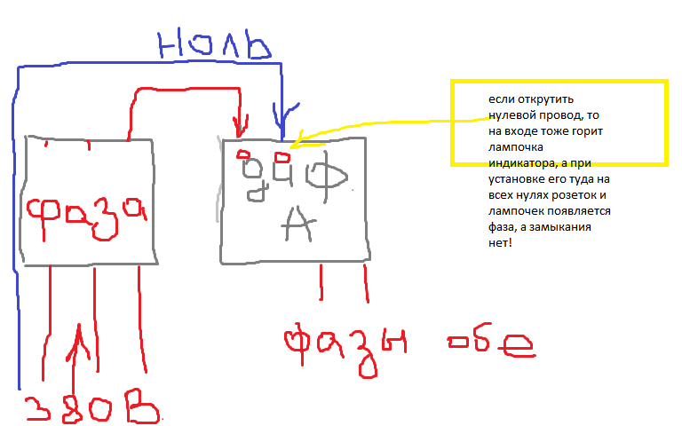 После рубильника фаза и ноль пришли на диф. автомат. На выходе с него замерил: на фазе и на НУЛЕ горит лампочка на тестере.