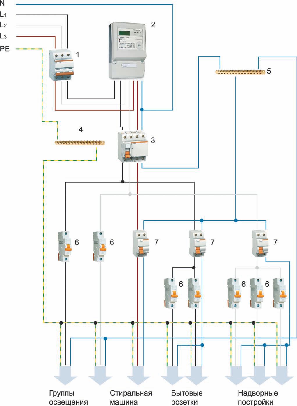 1 — вводный автомат; 2 — трехфазный электросчетчик; 3 — дифавтомат; 4 – шина заземления; 5 – нолевая шина; 6 — модульные автоматические выключатели; 7 — однополюсные дифавтоматы