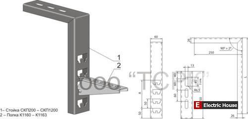 1. Предназначены для установки полок К1160-К1164 при прохождении кабельной трассы под потолком. В вертикальной плоскости кабельные стойки имеют отверстия для установки кабельных полок с шагом 50мм.
