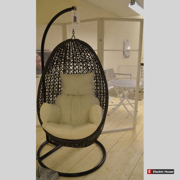 Кресло выполнено из искусственного ротанга черного цвета, каркас стальной. Такое подвесное кресло можно крепить к потолку благодаря прочной пружине.