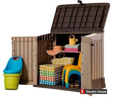 Позволяет хранить любые предметы на улице в условиях сухости и проветривания. Конструкция рассчитана на любые погодные условия. Нижняя панель и опора для полки создают дополнительные и удобные варианты хранения. Механизм фиксации крышки избавляет от необходимости поддерживать ее при открывании.