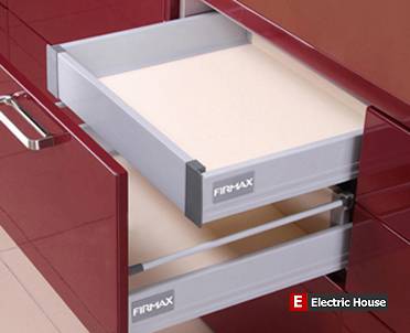 Firmax Newline: направляющие полного выдвижения с механизмом обратного демпфирования для компенсации шума и доводчиком для плавного закрытия ящика. Механизм синхронизации для улучшения боковой стабилизации ящика и снижения уровня шума. Рассчитан на 60000 циклов открытия/закрытия при динамической нагрузке в 35 кг.
