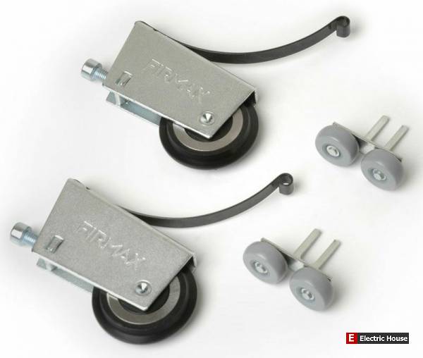 Комплектующие системы раздвижных дверей FIRMAX: ролики для симметричного и асимметричного профиля, позиционеры для роликов, петли для распашных дверей, уплотнитель для вставки 4 и 8 мм, щеточный уплотнитель, доводчик.