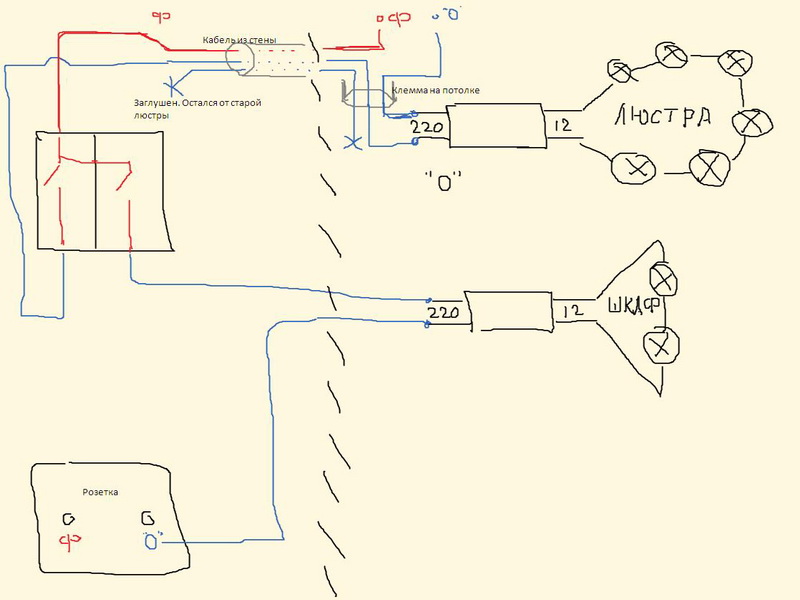 У меня подключены по этой схеме люстра с галогенками и светильник с галогенками. но вместе не работают. включаю шкаф - горит. При включеном шкафе включаю люстру - люстра загорается шкаф гаснет. При включенной люстре шкаф не загорается. и еще при включенном ТОЛЬКО шкафе на люстре начинают тускло гореть лампочки (хтя фаза на люстру разомкнута) Что может быть?