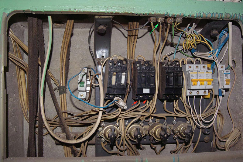 Что-то я глубоко задумался... Пакетник у меня погоревший (2-й слева), а защитный нуль ведь идет от него на клемму на корпусе щитка... Не может это означать, что этот нуль реально висит в воздухе? Вернее, просто на корпусе щитка.