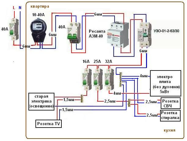 - АВ 16А, 2,5 мм2 - розетки кухни (количество жил не указываю),