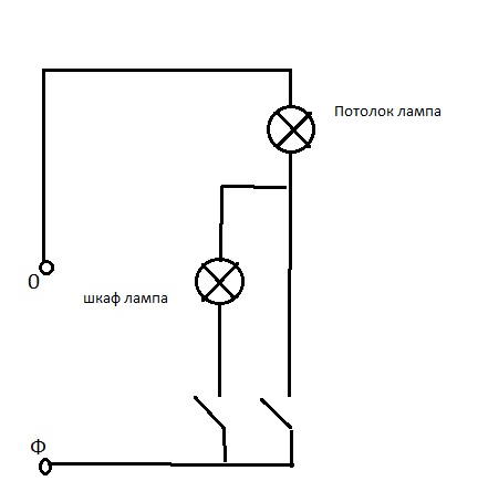 Просто перемыкали 3 провода вместе без выключателя (фаза + потолок + шкаф) работает только потолок, при отдельном подключении работают и потолок и шкаф...