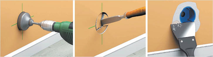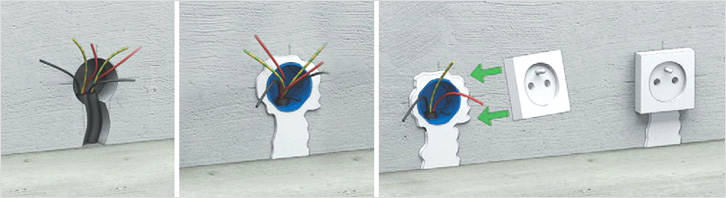 • В подготовленном ранее отверстии при помощи гипсового раствора крепится пластмассовая монтажная коробка; причём перед установкой с неё удаляются заглушки с отверстий под провода.