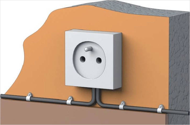 В случае открытой проводки выключатели и розетки монтируются, как правило, на специальных подрозетниках или же прямо на стене. Крепление изделия осуществляется обычным способом – при помощи дюбелей и саморезов.
