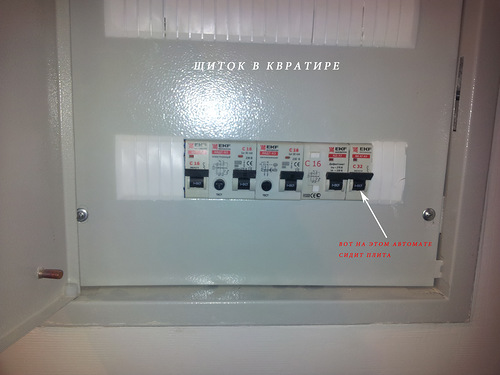 Беру кусачки откусываю провод, вырубается вся квартира, при этом ни каких ба-бах, искр нет никаких. Бегу к щитку в квартире все включено кроме плиты, (его я сам выключал), бегу к щитку в подъезде тот самый черный автомат однополюсный отключен, зажмурив глаза включаю его, о чудо все работает.