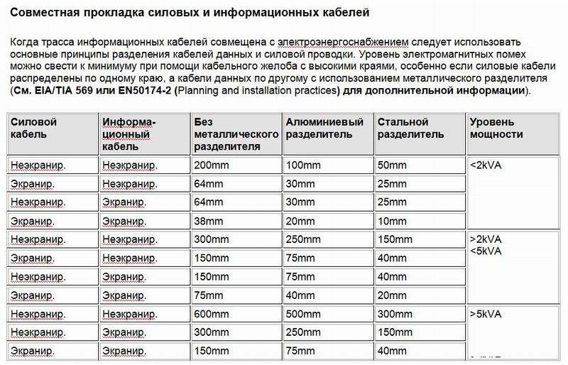 С точки зрения взаимного влияния, особенно силовых линий на сигнальные, предпочнительным является удаление слаботочки от силовых линий на расстояние, зависящее от экранировки, наличия перегородок, мощности в силовой линии...