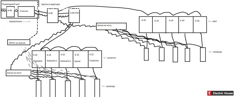 40А в подъезде, счетчик, 32 в квартире, 64 УЗО, 16 розетки, 10 свет. Так? Точно 40 в квартире лишние будут?