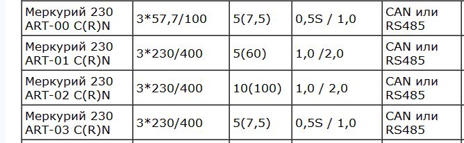 116rus писал(а):Есть счетчик Меркурий 230 ART-01 и есть ART-02. У первого номинальный ток - 5А, у второго - 10А! Максимальные токи тоже разные.