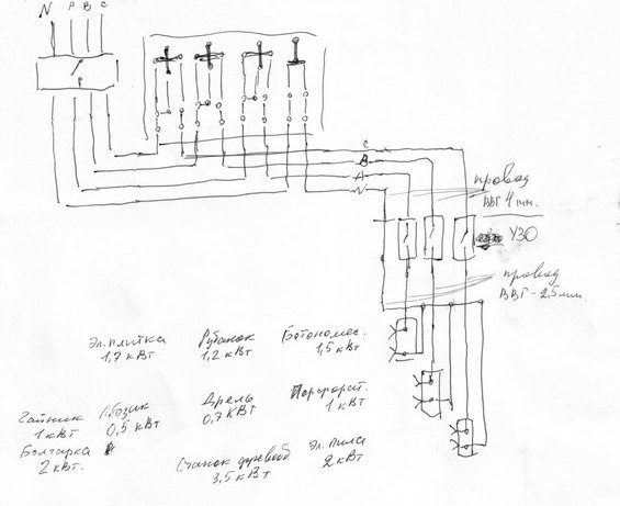 Дом будет строиться 3-5 лет, пока по нему никаких планов о проводке электричества не ведется. На данном этапе нужно запитать только гараж, а именно, розетки по 220 на каждую фазу и розетку 380. Освещение в гараже не планирую (пока будет переносной прожектор).