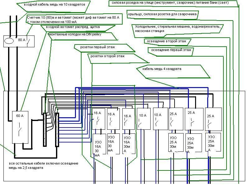 по схеме ввод в дом медью на 10 квадратов на счетчик в пластиковой коробке, за счетчиком автомат (возможно диф автомат с током отключения 100 ма) на 80 ампер, далее медь на 10 квадратов до распределительного щитка, на щитке общий автомат на 60 ампер, далее разводка на автоматы по группам (двухполюсные), группы будут следующие: 1 розетки первый этаж, 2 розетки второй этаж (две группы, так как на второй этаж пойдет два кабеля под розетки), 3 освещение первый этаж, 4 освещение второй этаж, 5 стиральная машина, водонагреватель, насосная станция, холодильник (вот это хочу заземлить, достаточно ли будет пары ведер с солью зарытых на два метра), 6 линия на крыльцо (освещение и розетка для подключения инструмента для работы на улице перед домом), 7 линия на баню и подключения инструмента для работы с зади дома.