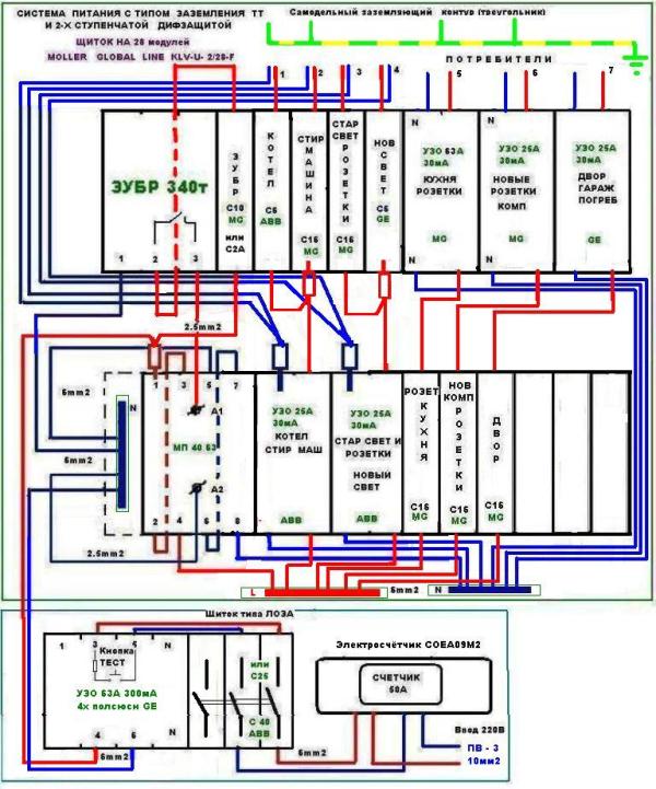 частный дом- (старая и новая часть),линия воздушка, голый алюминий, ввод 2-х проводной (алюминий переходит на медь 10мм2), заходит прямо на опломбированный счетчик, со счетчика - фаза L - на 6 шнайдеровских автоматов ВА63 С16, ноль N соединен вместе, через клеммы WAGO.
