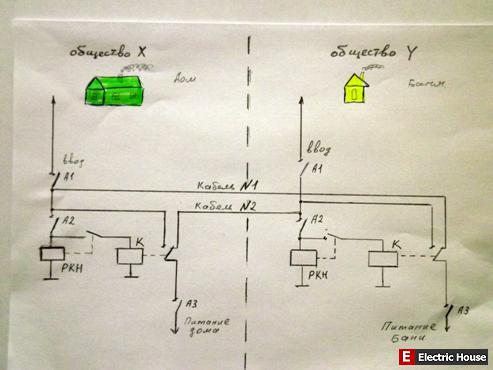 Есть один недостаток , то в одном , то в другом обществе частенько пропадает электричество. Желание клиента таково, нужно сделать так чтобы при пропадании в каком либо садовом обществе электричества, оба здания запитывались от того общества в котором ток есть. То есть либо от X общества и дом и баня , либо от Y общества и баня и дом. А когда ток есть в обоих садовых обществах, то от X запитан только дом, а от Y запитана только баня. Между домом и баней уже есть 2-х жильный кабель , пока что пустой (новый). И желательно чтобы это было пожаробезопасным и не встретились фазы 2-х обществ.