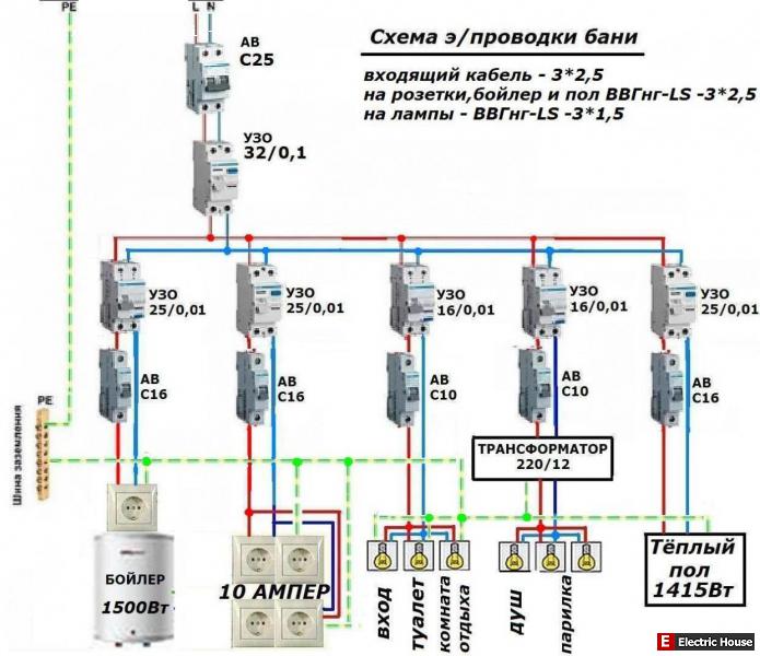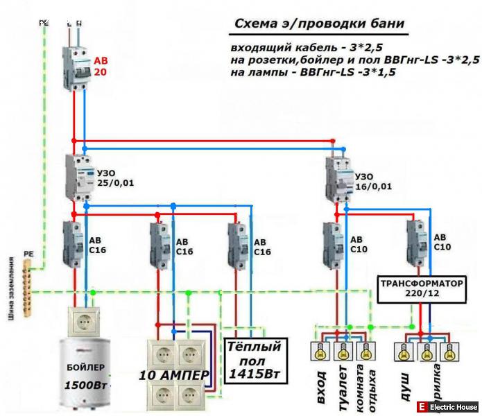 Здравствуйте! Не нашёл ответ на свой вопрос, составил схему для своей кирпичной бани, отделанной изнутри деревом. Входящий кабель какой-то медный многопроволочный. Скорректируйте, плз. Автоматов, узо не много нарисовал? По деньгам нехило получилось... Спасибо.
