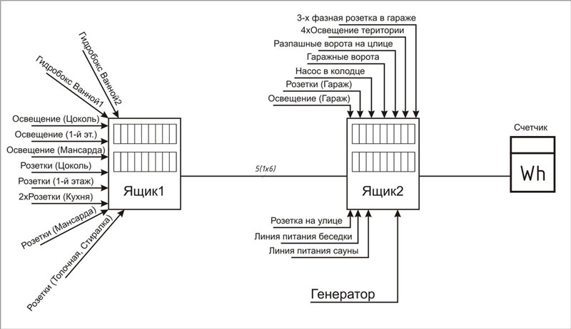. Доделывать решил сам. Примерную схему разводки привел во вложении. Будет два щитка. Один в доме, другой в гараже (который находится в этом же доме). Учетный ящик будет на улице. Автоматы, ящики,.. хочу ставить Hager. Освещение разведено 3х1,5. Все остальное 3х2,5. Ящик1<->Ящик2 - 5 проводов сечением 6мм. Вот пришло время закупать ящики и стал вопрос на сколько групп их брать. А теперь собственно вопросы:1) Узо. Куда какие? Одну на всех или всем по одной. Какой ток утечки должен быть. (кухня, гидробоксы, стиралка, розетки, весь дом,...)