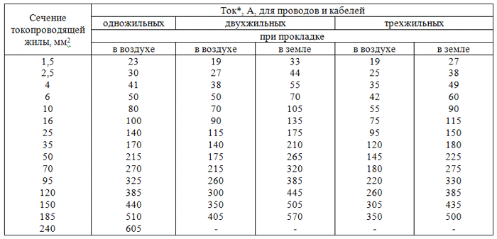Таблица 1.3.4. Допустимый длительный ток для проводов и шнуров с резиновой и поливинилхлоридной изоляцией с медными жилами
