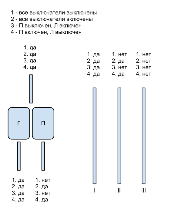 3. не знаю. По мое логике на проводе I ( он же тот, что подключен к левому выключателю) ток должен присутствовать только тогда, когда выключатель включен.