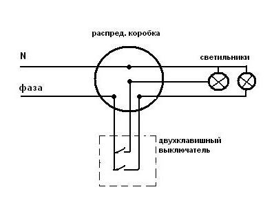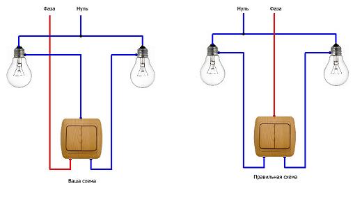 Должно быть так: на двухклавишный выключатель идет трехжильный провод. Фаза приходит сверху и двумя жилами уходит через коробку на лампы. С потолка приходит трехжильный или четырех (если есть заземление ) провод. Фаза с выключателя, через коробку, две жилы на две группы ламп с них на одну общую третью жилу обратно в коробку на ноль. В коробке два провода. Который на выключатель - одна жила на фазу, провод на лампы одна жила на ноль, оставшиеся две жилы на обоих проводах соединяем с одного провода на другой по отдельности.