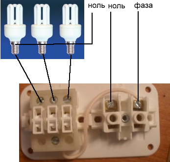 В коробку должна приходить одна фаза от щитка, один ноль от щитка и 3 провода от ламп. Это вариант первый и правильный.