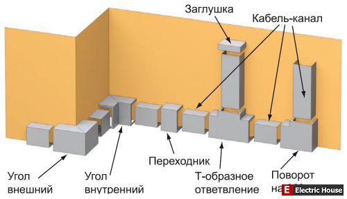 Как правило, электроканалы выпускаются в виде отрезков по 2 м в длину. Продукция иностранных фирм может иметь другие размеры. Например, французская компания Legrand выпускает короба длиной 2, 2,2, 2,5 и 3 м. Ширина и высота в зависимости от сечения и количества проводников могут быть от 10 до 60 мм. При помощи различных аксессуаров, поворотных углов, тройников и заглушек к кабель-каналу, монтируются электрические сети любого типа сложности. Кроме поворотных элементов существуют специальные вставки для монтажа розеток и выключателей прямо на поверхности коробов.