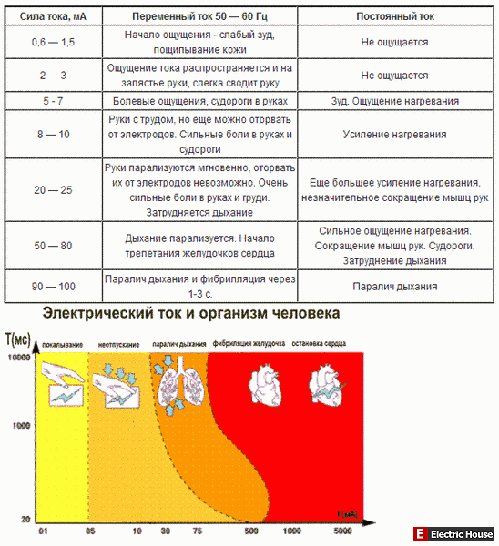 Также привожу эту картинку с сайта по основам электробезобасности, где есть таблица с описанием действия различных величин токов, что отсутствовала в предыдущем.