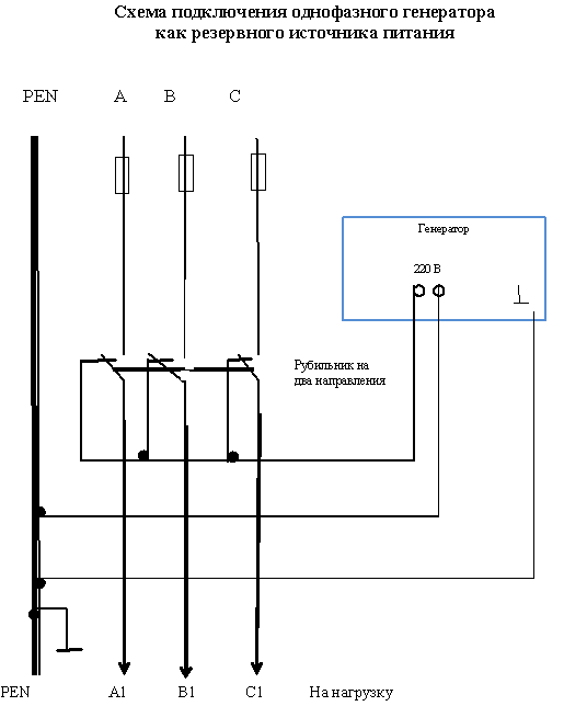 | Подключение трехфазной сети к однофазному генератору |