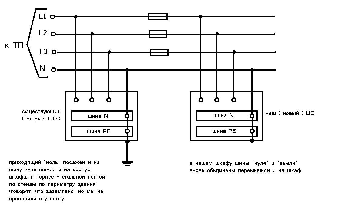 Кабель приходит четырехжильный? Тогда это приходит PEN проводник на шину N??? Почему не на шину PE? На шине PE виден наконечник-это соединение с заземлением? По второму рисунку не показано есть ли заземление на новом ШС , соединены ли корпуса старого ШС и нового? Старый ШС не действующий? Там получается просто заземлен PEN проводник. В новом ШС необходимо поставить перемычки между шинами N и PE , PEN проводник подключить на шину PE. Контур заземления присоединить к шине PE. |