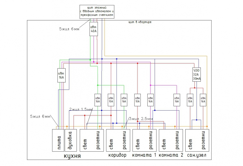 Квартира новая, проводки нет, только торчит водной кабель NYM 5x6мм (PE,N), автомат перед счетчиком 40А или 63А, пока не поставят точно не известно, счетчик на 3 фазы, дают 10 кВт на квартиру, по квартире все тянуть самому.