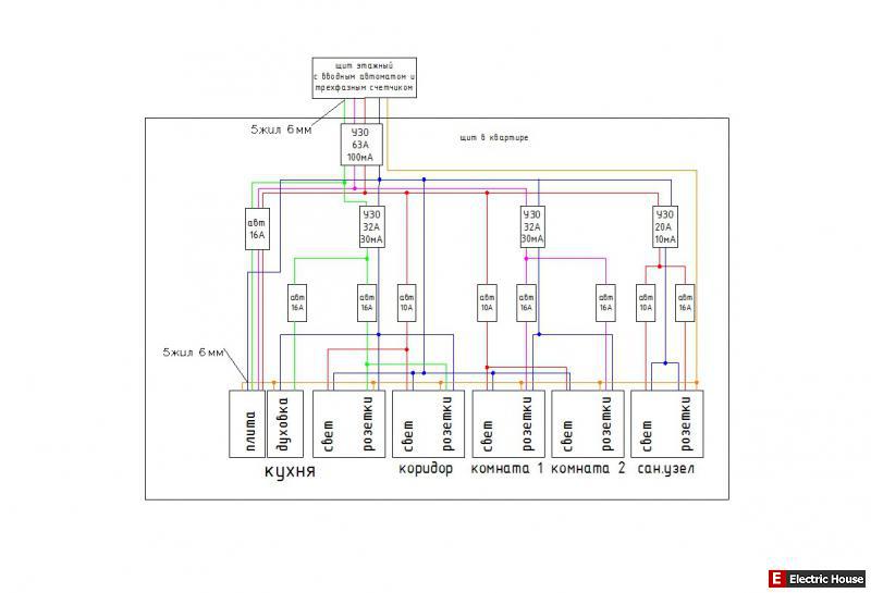 1. Провода после вводного УЗО должны иметь то же сечение, что и до него , то есть 6 мм2 и никаких 2,5 или 4... 2. Определитесь с духовкой и плитой... не могут они обе быть трёхфазными... По крайней мере, духовка независимая однофазная и подключается к линии 3*2,5, плита - иное дело, но и на неё закладывать сечение менее 4 мм2 ... мягко, говоря, легкомысленно. А при однофазном подключении - не менее 3*6 в обязательном порядке. 3. УЗО 10/0,01 применено вообще не к месту... Если есть желание ставить на эти две группы УЗО, то тогда 32/0,03 4. Возвращаясь к вводу... не вижу смысла в диф. автомате после автомата. К тому же, F204 - УЗО, а не диф... |