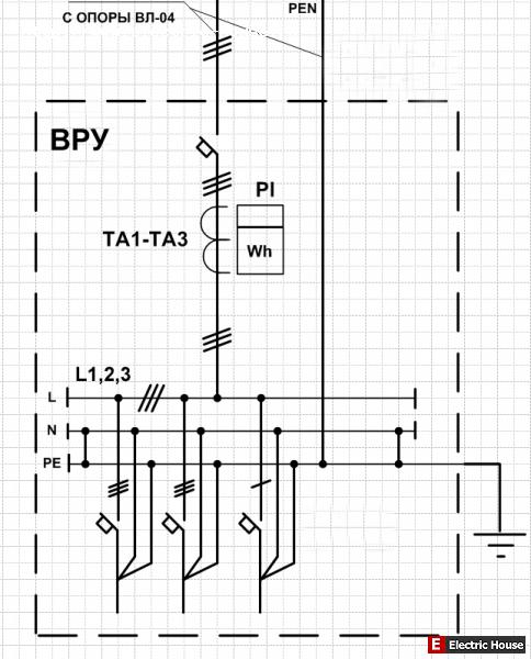 Просмотрел несколько схем, почитал ПУЭ и составил свою по которой надо собрать ВРУ в принципе собрать знаю как а вот нарисовать, буду рад принять замечания, да после учёта не поставил коммутационный аппарат.