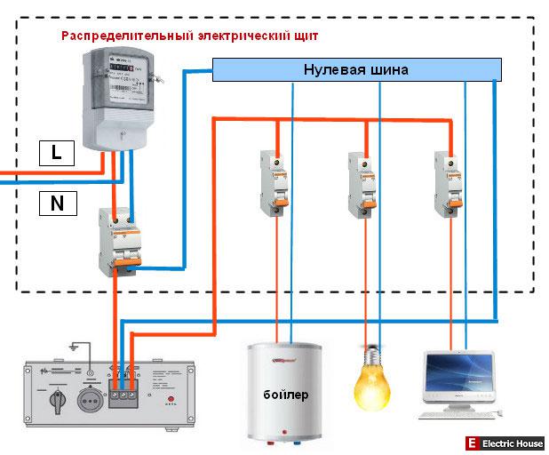 Обратите внимание стабилизатор с одной входной нулевой клеммой. Если стабилизатор имеет два входа и два выхода, тогда схема будет несколько иной, то есть в щитовой устанавливаем дополнительную нулевую шину к ней подводим нулевой проводник (отходящий) и далее к ней подключаем нулевые проводники потребителей. Стабилизаторы напряжения следует обязательно заземлить!