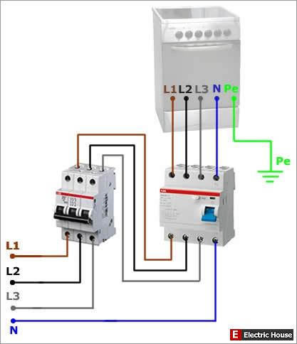 Схема подключения электроплиты через УЗО для трёх фаз: