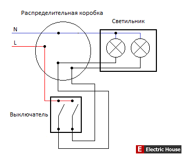 В распределительной коробке провода или скручиваются и изолируются или соединяются через клемму в зависимости от типа распределительной коробки. Питающий фазный проводник (L) через распределительную коробку подключаем к среднему проводу двухклавишного выключателя. Два уходящих с выключателя провода через распределительную коробку соединяем с двумя проводами светильника, подключенным к центральным контактам электропатронов для ламп.
