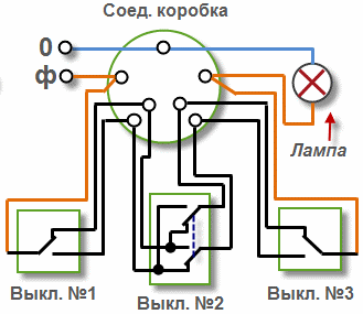 Схема подключения проходного выключателя для управления светильником из 3-х мест.