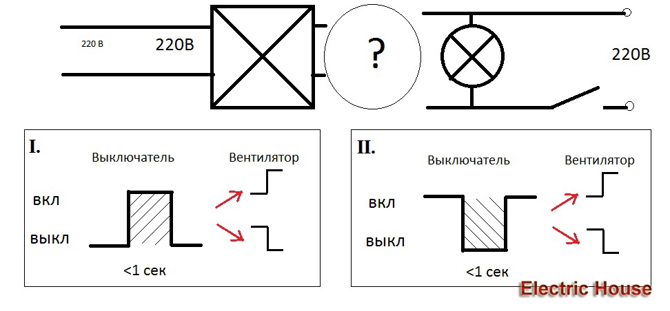 Схему работы прикладываю (коллега нарисовал с моих слов). Т.е. двойным нажатием вытяжка включается или выключается. При этом освещение работает как обычно. Можно ли сделать такое включение? Что требуется для этого, какие конкретно детали купить в строительном магазине?