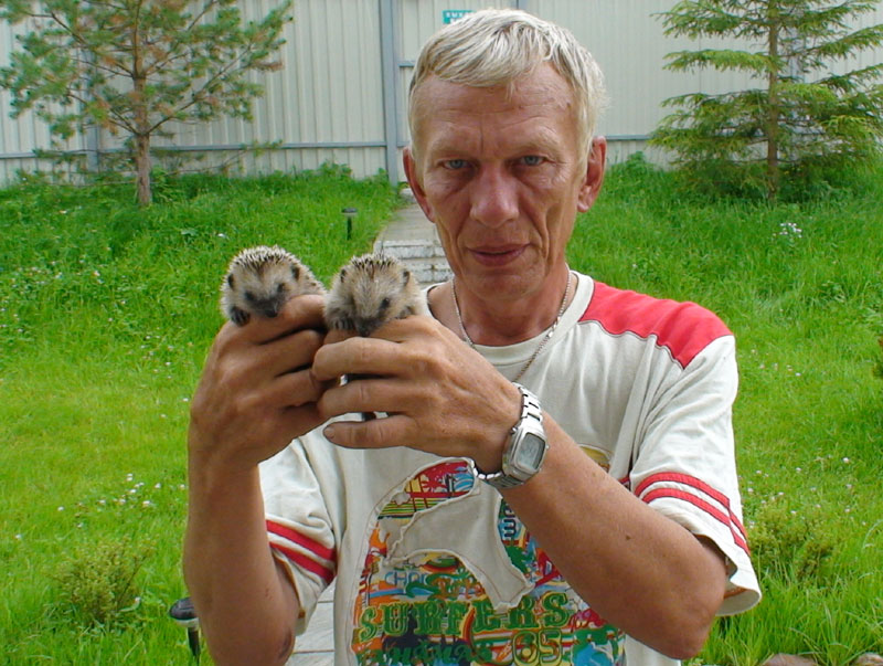 Сегодня утром мой ёжик привёл братика. Теперь у меня живут два ёжика. Но произошёл казус, оказывается был ещё и третий, в дальнем углу участка - мой рабочий увидел его только когда проехал по нему газонокасилкой (жалко, бедное животное погибло). Хорошо что хоть этих двух спасли. Теперь при косьбе будем убирать ёжиков в загон (уже соорудил) Проверили весь участок - вроде больше ёжиков нет. Видимо их мать пострадала от собак... остались сироты. Назвали - Фомкой и Стёпкой.