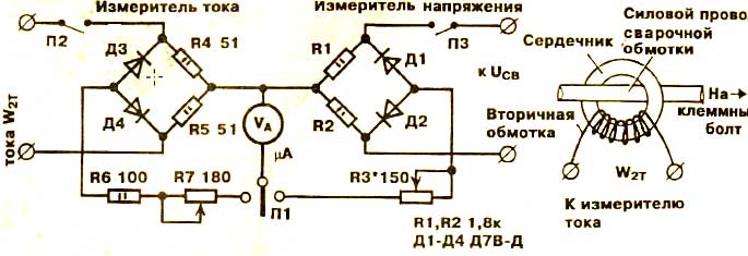 Рис. 9. Принципиальная схема измерителей напряжения и тока сварки и конструкция трансформатора тока