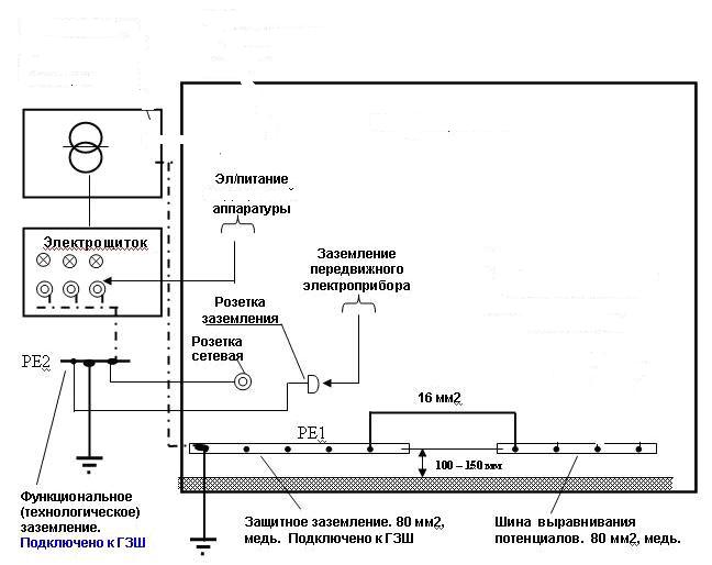 Есть подстанция, в ней главная заземляющая шина, соединённая с контуром заземления (который проходит под зданием) при помощи болтового соединения. От подстанции силовой кабель идёт к ПР-ам в металической трубе, со стороны подстанции, эта труба жёстко приваренна к главной заземляющей шине, а с другой стороны, жёстко приваренна к корпусу ПР, от ПР к ПР на других этажах кабель идёт таким же образом, в трубе, жёстко приваренной к корпусам ПР. Та самая экранная комната представляет собой фактически металическую коробку, также жёстко сваренную полосой с корпусом ближайшего ПР. Т.е. сама комната, несколько ПР, и главная заземляющая шина, являются одной жёсткой заземляющей шиной.