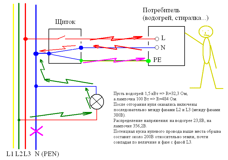 а есть ли в этом смысл.Принцип работы зануления: при пробое фазной цепи электроприбора на зануленный корпус фактически происходит короткое замыкание "фаза-ноль". Ток в цепи при этом увеличивается до очень больших величин, что вызывает быстрое срабатывание аппаратов защиты (автоматические выключатели, плавкие предохранители), которые отключают линию, в которую включен неисправный прибор. Кроме того, если в этой линии установлено УЗО, но оно срабатывает тоже, но не от большой величины тока, а из-за неравенства токов в фазном и нулевом рабочем проводах, т.к. бОльшая часть тока течет от фазы через цепь защитного зануления мимо УЗО. Если на этой линии установлены и УЗО и АВ, то сработают либо они оба, либо что-то одно, в зависимости от их быстродействия и величины тока замыкания.