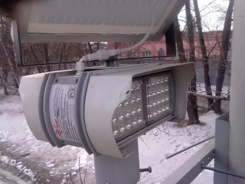 Чтобы водитель издалека обратил внимание на приближении к пешеходному перекрестку были установленны сигнальные огни на светодиодах. Работают они от солнечной батареи, мигают днем и ночью.