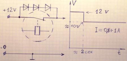 Да, есть такая фишка, как погашение небольшого лишнего напряжения за счет прямого падения напряжения на диодах. В зависимости от характеристики диода, можно и одним обойтись, и двумя. Но, как я вижу из графика, вам надо понизить напряжение не сразу, а спустя 2сек после подачи напряжения. То есть вам нужен транзисторный ключ-усилитель, на управляющий переход которого через 2сек подавалось бы нужное напряжение смещения (для биполярных) или напряжение отсечки (для полевого). А для этого в схеме должна быть заряжающаяся RC-цепочка.