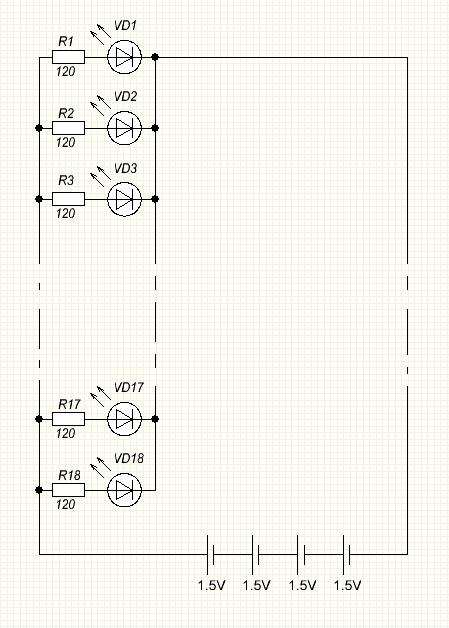 но я знаешь как делаю? взял 4 батарейки по 1.5в и подключю их к 18 светодиодам 3в ,20мА.преждевременно припояв к диодам параллельно резисторы на 150 Ом 0.5 ватт перепаяй последовательно |