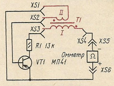 Проверяемый трансформатор TI подключают (с соблюдением фазировки, если она известна) к каскаду, выполненному на транзисторе VTI и омметру, установленному в режим измерения больших сопротивлений («X 1000»). В коллекторную цепь транзистора включают обмотку с большим числом витков (а значит, и с большим сопротивлением), а в базовую — с меньшим. Если коэффициент трансформации близок к единице, порядок подключения обмоток роли не играет. Омметр с транзисторным каскадом и трансформатором образуют блокинг-генератор — генератор коротких импульсов. Появляющиеся в коллекторной цепи транзистора импульсы тока отклоняют стрелку омметра от условного нуля отсчета. Для определения нуля отсчета нужно (после установки нуля омметра) замкнуть гнезда XS1 и XS2. а верхний по схеме щуп омметра подключить к гнезду XS3. Деление, до которого отклонится стрелка омметра, и будет нулем отсчета.