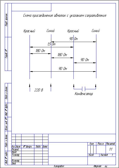 Интересно, как измерили сопротивление 1,5 Ом? Если считать что вывод Красный 1-й и Красный 2-й одно и тоже, то напряжение надо подать на выводы: Синий 1-й и любой Красный (180 Ом), а конденсатор подключить к Синему 2-му и , в зависимости от требуемого направления вращения, или к другому Красному или к Синему 1-му (т. е. шунтируя одну из обмоток по 90 Ом). |