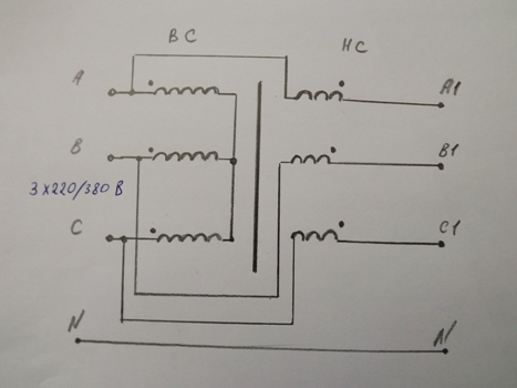 Схема подключения трансформатора. Если перепутаете начало и конец вторичной обмотки - ничего страшного! В одном случае напряжение будет прибавляться, в другом отниматься.