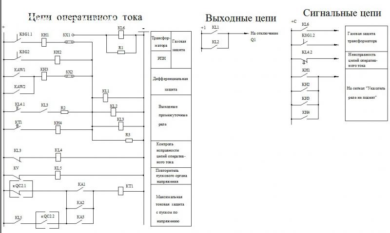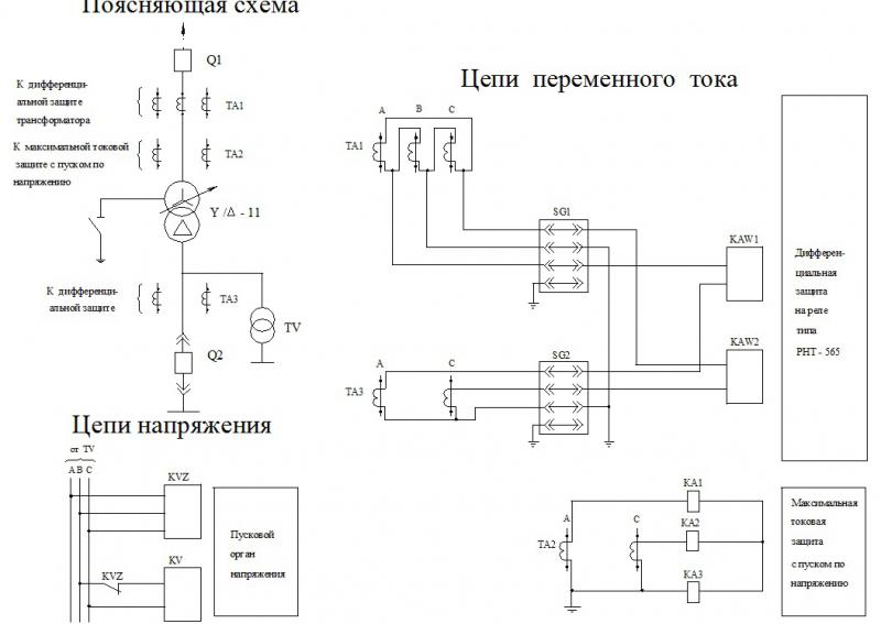 Мне необходимо было выбрать защиту трансформатора по расчетам я выбрала диф.защиту с реле РНТ-565 с насыщающимися трансформаторами тока и мтз с пуском по напряжению. Помогите прочитать схемы, пожалуйста!